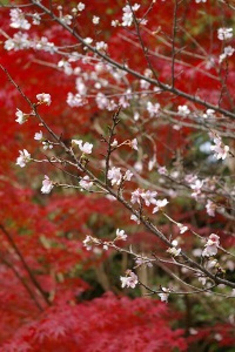 | 真っ赤なもみじの間に咲く、可憐な冬桜 |