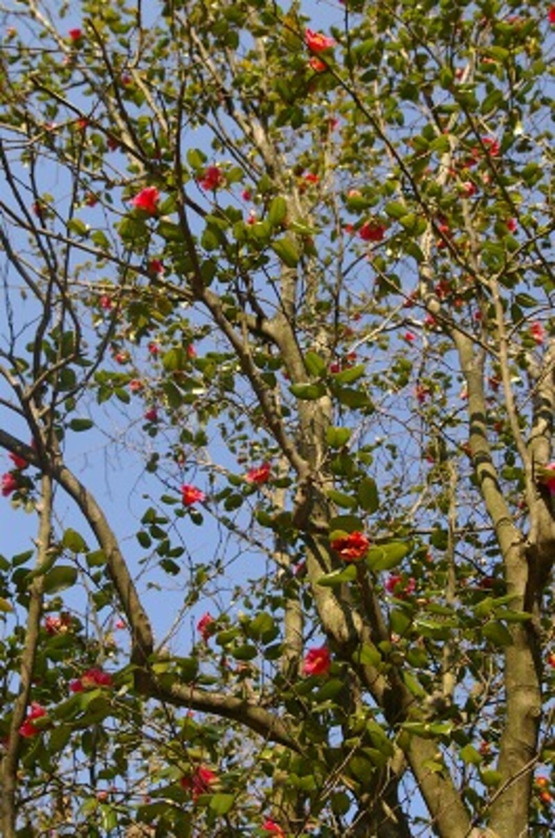 お茶席の飾りに欠かせないためか、鎌倉の寺でも、たいていどこにでもあります。庭園などで見かけるのはわりと低い木が多いようですが、剪定しないと大樹になるらしく、山がちな鎌倉では、半ば野生化した椿の巨樹に出会うこともあります。