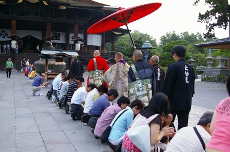 ひとつは、「お数珠頂戴」といって、法要のために本堂に向かう偉い僧侶の方が、並んで待っている参拝者の頭を数珠で撫でてくださること。もうひとつは、善光寺を護持する二つの宗派、天台宗と浄土宗の勤行が、順に行われることです。