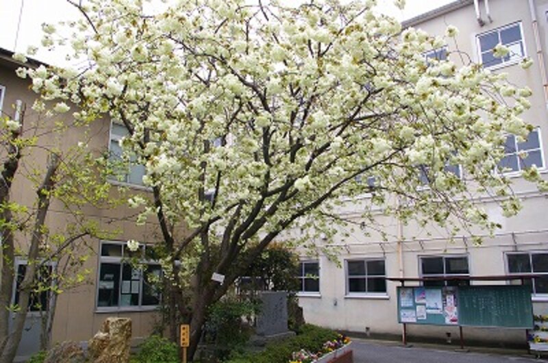 | 嘉楽中学校の御衣黄桜は、ほんのり緑色 |