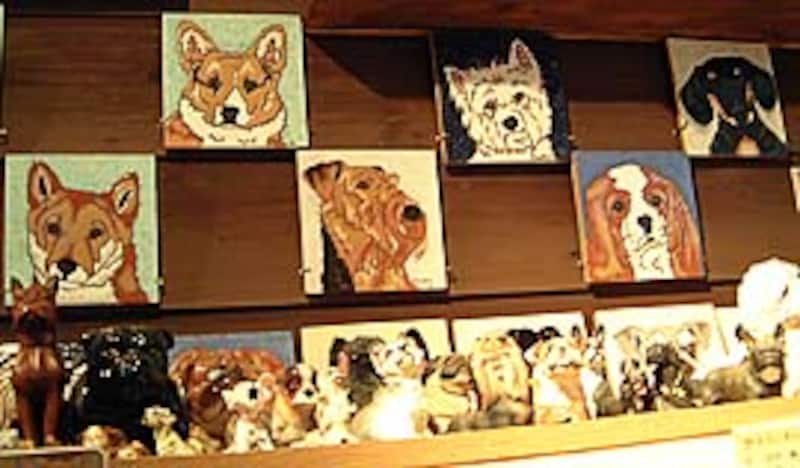 ウェルカムボードなどのドッググッズ、さらにバッグや書籍、イラスト、クッキーなどなどが所狭しとディスプレイされています。