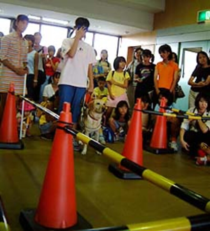 見学会の最後に、集まった人が実際に盲導犬との歩行を体験するコーナーがありました。ポールなどを使って障害物をつくりクランクになっている道を、最初はアイマスクを付けて白杖歩行をし、次に盲導犬と一緒に歩いてみるわけです。体験した2人の女の子の話によれば、白状歩行だと腰が引けてなかなか前に足を踏み出すことができなかったのが、盲導犬といっしょだと彼の歩様にあわせて自然に足が前へ出たそうです。