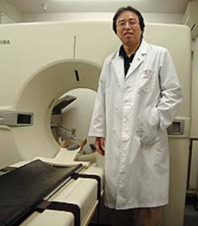 | ★CT(医療用X線CT装 置)の前に立つ南先生 |