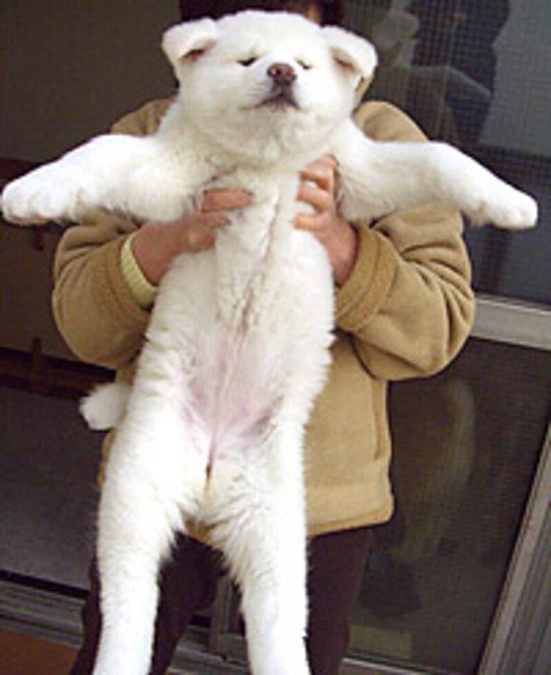 大きい順に、虎次郎(トラ ♂ 黒虎 4カ月)、桜(サクラ ♀ 赤 3カ月)、珀(ハク ♀ 白 2カ月)の3頭です。とくに珀は、秋田の大館から100CLUBに来てから数日とあって、ミルクのにおいがするような本当の幼犬です。3頭ともまだ乳歯が生え替わっておらず、挨拶がわりに尖った細い歯でカプカプ噛んでくるので、こちらも負けじとギュウギュウ抱っこしかえしてやりました。それにしても、顔が埋まってしまうほどのすごい毛量、将来的に大きな身体を支えていくための頑丈な足…いつも見なれている小型・中型犬とはものが違います。
