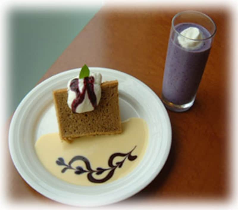 まずケーキだけをいただいてみると、エスプレッソの香りが口いっぱいに広がる。つぎに生クリームとブルーベリーソースを添えて食べると、いっそう香りが引き立ち、お味も引き締まった感じに。最後にカスタードとチョコレートソースをたっぷり付けてみると、まったく別のケーキに変身しました。3つの味が楽しめるシフォンケーキは、ここでしか味わえないオススメの一品といえるでしょう。