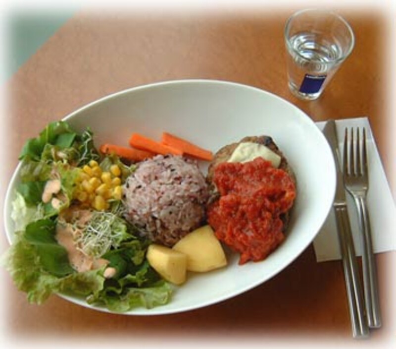 今回わたしがいただいたのは、黒米と減農薬のサラダ付きのイタリアンハンバーグプレート。ランチはこのプレートにドリンクがついて¥1050。トマトソースの赤と黒米のピンク、それがサラダのグリーンや黄色とあいまってとてもカラフルなメニューになっています。お味のほうはトマトソースのサッパリ系。黒米も甘さあっておいしい。ボリュームも十分でした。
