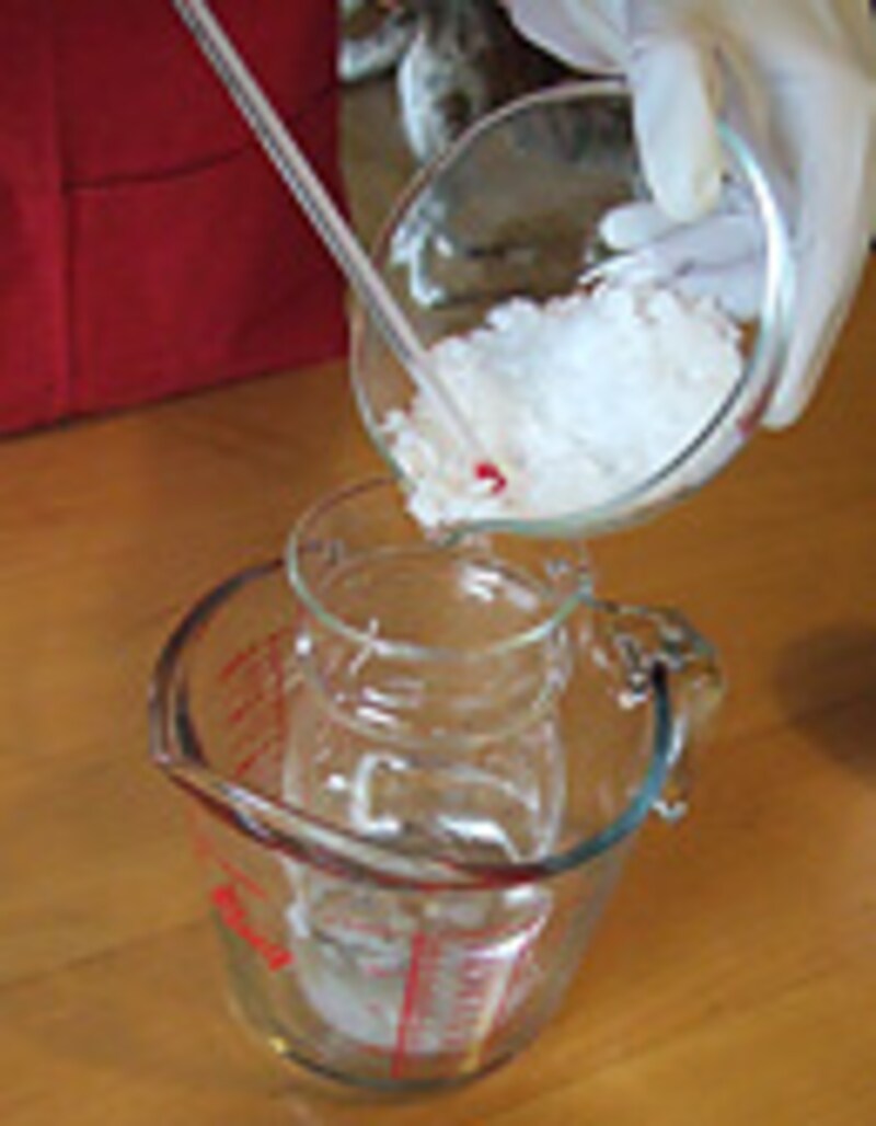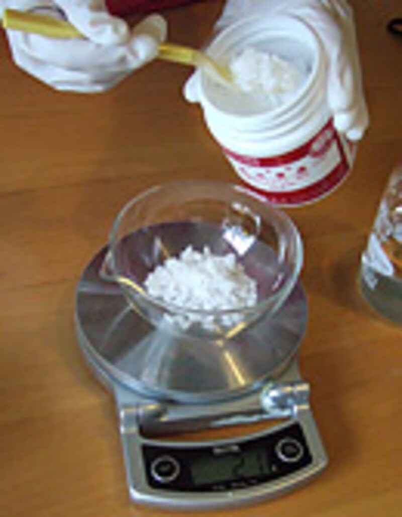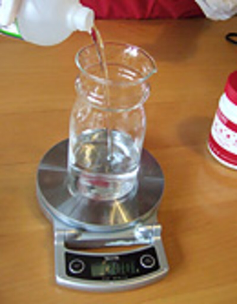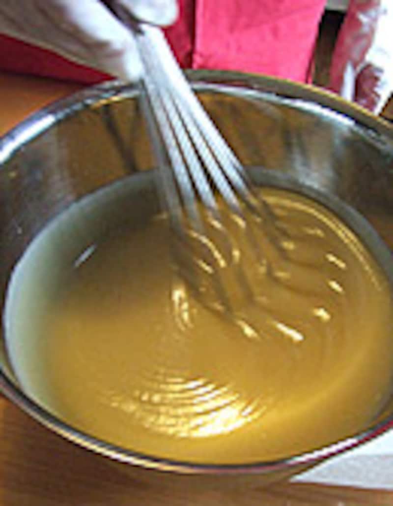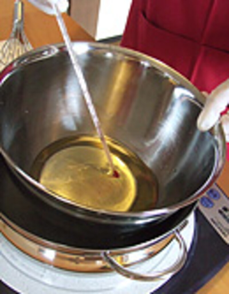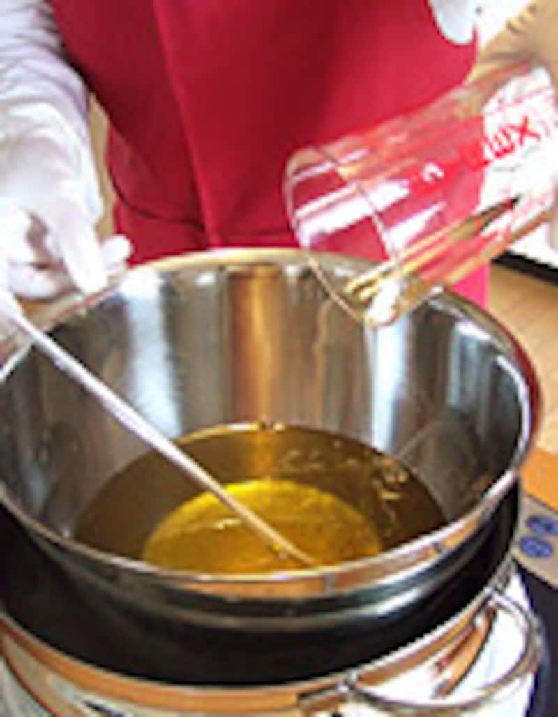 順序としては、最初にアルカリ水溶液をつくって45℃まで冷まします。次に、油脂と植物性脂肪酸(ミリスチン酸など)を溶かして混ぜベースオイルミックスを作り、これを先のアルカリ水溶液と同じ45℃に調節する。そして次に、ベースオイルにアルカリ水溶液を少しずつ注ぎ、15~20分間攪拌するわけですね。