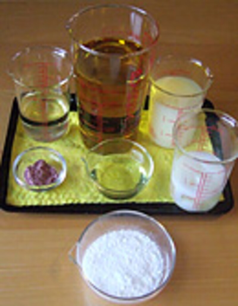 | 【油脂類】 ベースオイル オリーブ油 480g パーム油 160g ココナッツ油 80g ひまし油 80g 脂肪酸 ミリスチン酸またはステアリン酸 25g スーパーファット ホホバ油 15g 【アルカリ】 苛性ソーダ 90g 【水】 精製水 240g |