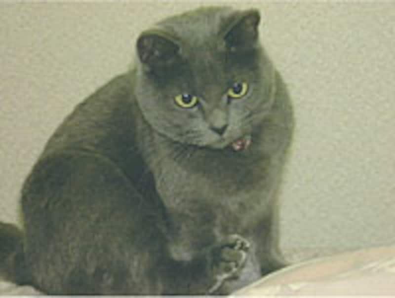 【グレー】(モデル:クリスちゃん)よく、ロシアンブルーみたいな子が欲しいと依頼される事があるのですが、グレーの雑種というのは殆ど出ません。この写 真の子は雑種なのですが、黒猫とヒマラヤンの間に出来た子、と聞いています。 私の経験上、グレーの被毛の雑種は神経質な子が多いように思います。 |