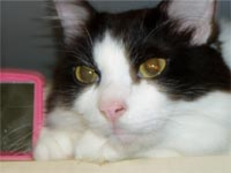 【黒白】(モデル:み~ふぁんちゃん)白地に黒いブチのある猫。たまに「牛柄」とか言われるようです。 ちょびヒゲみたいな模様だったり、その模様は様々で、見ているだけで楽しくなります。 一般的に写真の子(ガイド宅のみ~ふぁんですが)のように、鼻の周りにブチがある子は「鼻ぐろ」と呼びます。 |