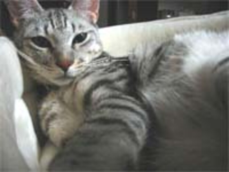 【サバトラ・サバトラ白】(モデル:栗太郎ちゃん)魚の鯖(サバ)のような模様である事から「サバトラ」と言います。ご覧の通 り、グレーに黒のトラ模様です。 サバトラ白と言うのは、全体がサバトラ模様で、手足の先やお腹、顔などが白い子を言います。 アメリカン・ショートヘアで言うと「シルバータビー」に似ています。 稀に、縞でなく豹柄になる事もあります。 (この写真ではよく分かりませんがモデルの栗太郎ちゃんは豹柄です。) |