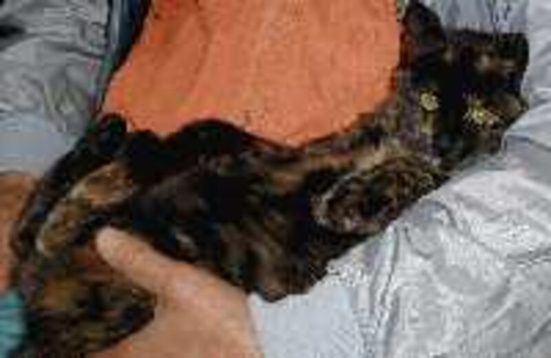 【サビ】(モデル:ブブちゃん)これも三毛猫の一種なのですが、サビとかむぎわらとか言われています。 血統書上では「トータシェル」というようです。 黒と茶が多いのが特徴です。 |