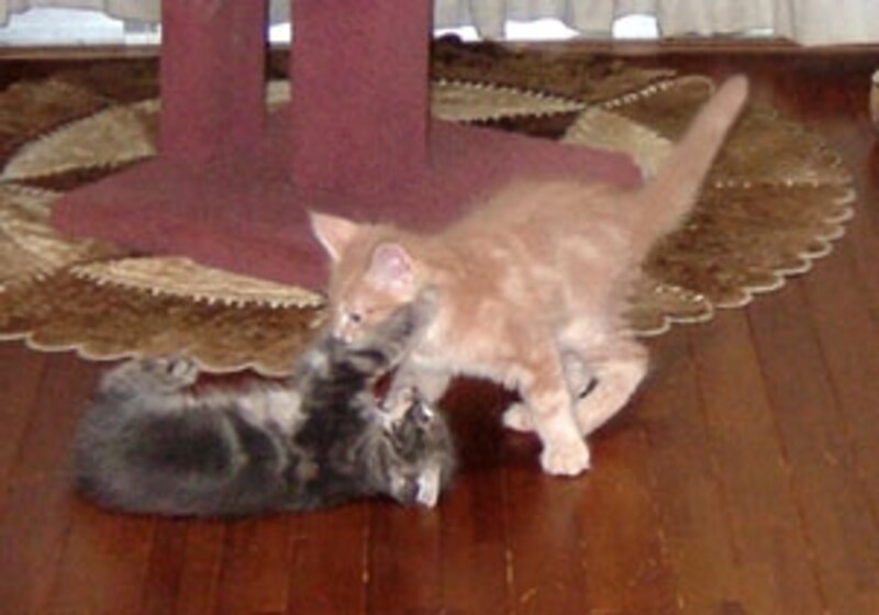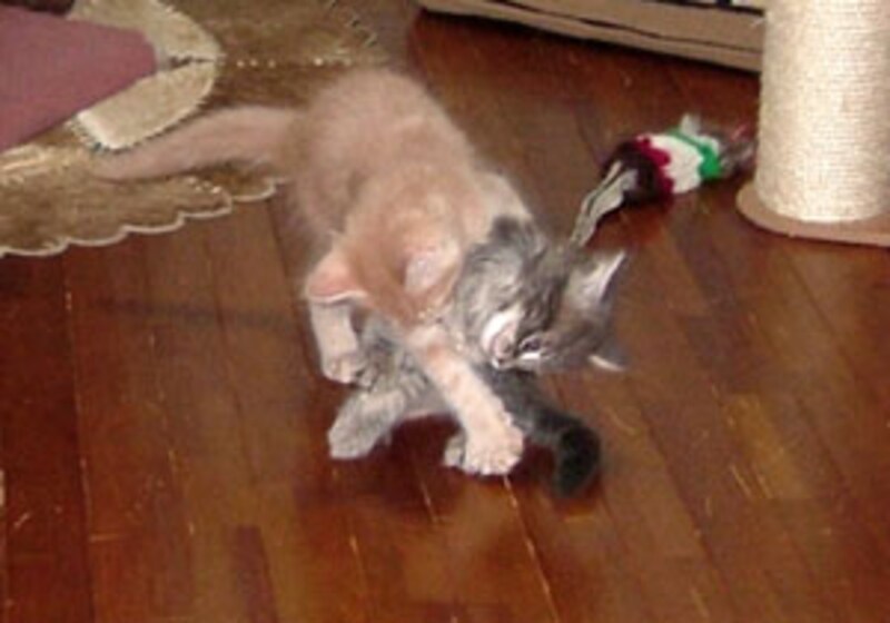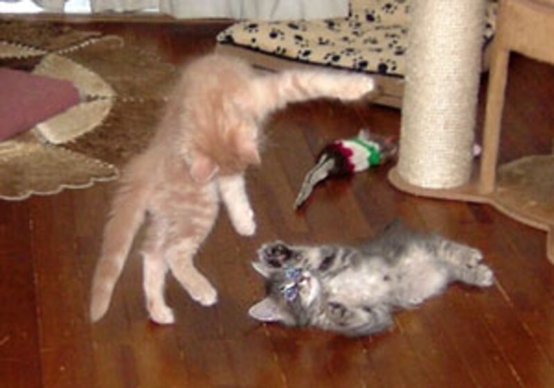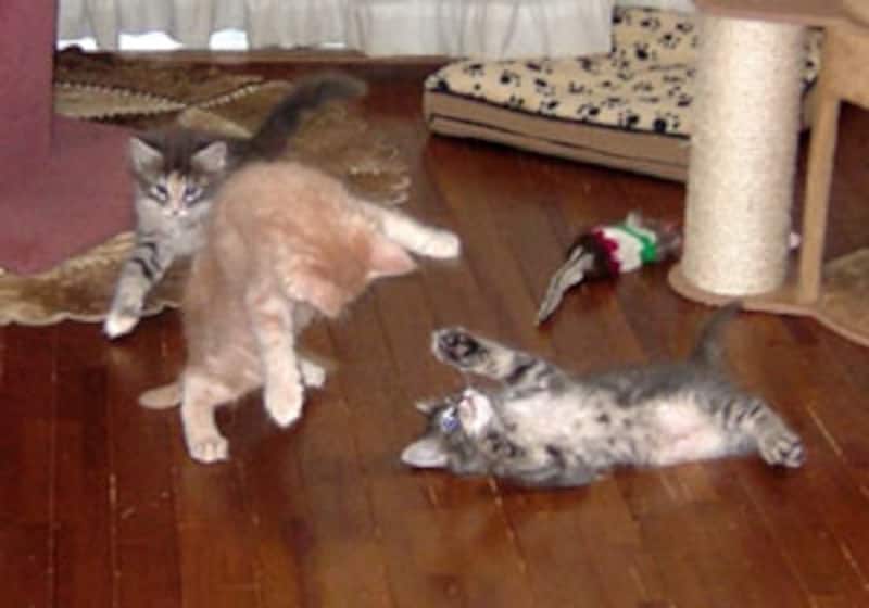 この時期の子ネコたちの遊びは、すべて「狩り」に通じる動きです。