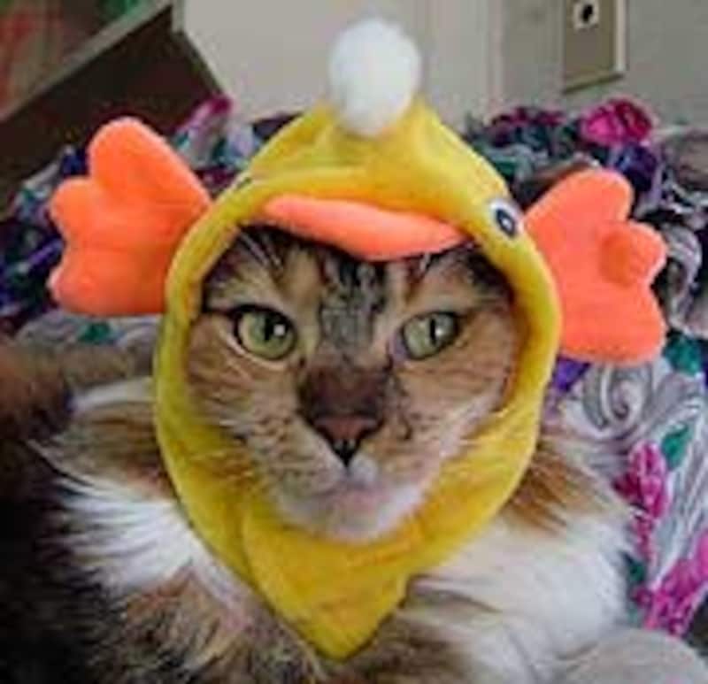 ただし、このかぶり物を全然平気で(というか、見た目には結構満足して)かぶってくれるネコもいますが、過半数以上のネコは嫌がるかもしれません。もちろん、ずっとかぶらせておくのではなくて、ちょっと写真を撮る間だけじっとしてくれたら、こちらは助かるのですが…。体にセロテープの切れっ端がくっついただけで、固まってしまったり、飛び上がってしまうネコもいますので、嫌がる子にはお勧めできませんね。。。