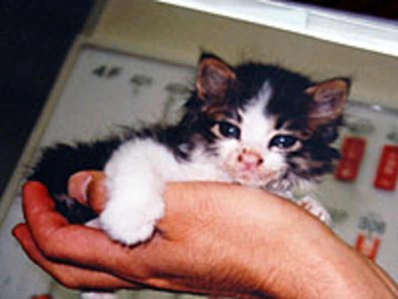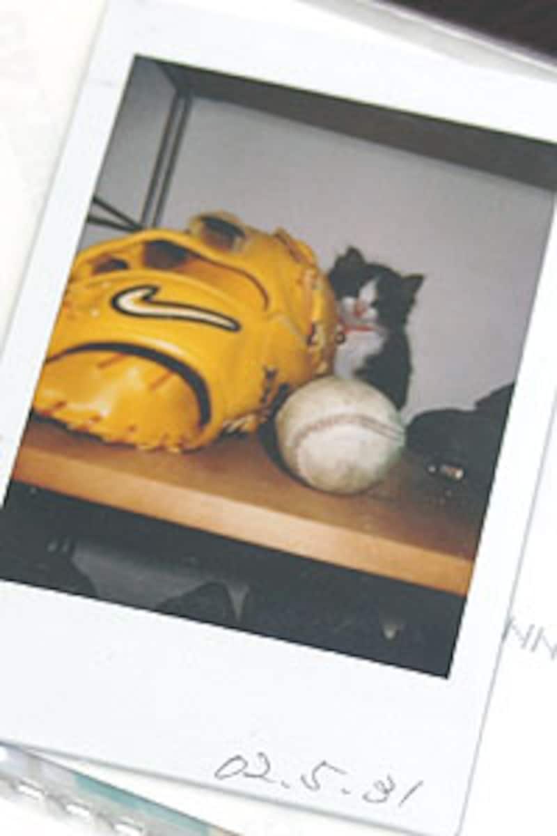 2002年5月、大宮球場でイースタンの試合があった日に、当時副寮長だった村田さんが、カラスに襲われかけていた子猫を助けました。生後1ヶ月弱のクリクリした愛らしい目の子猫、これがリョウ君でした。手のひらにすっぽり収まってしまう子猫はちょっと汚れていて、少し風邪を引いてお腹を空かせていました。