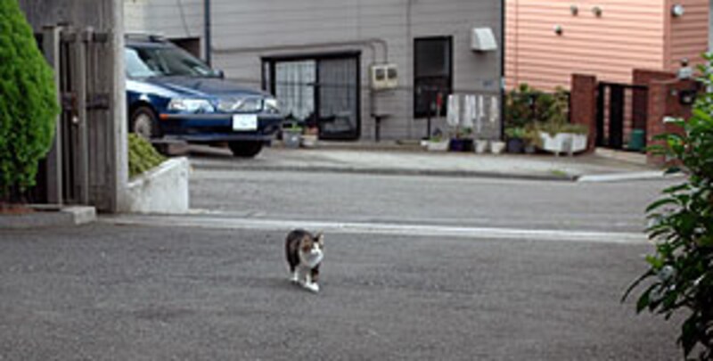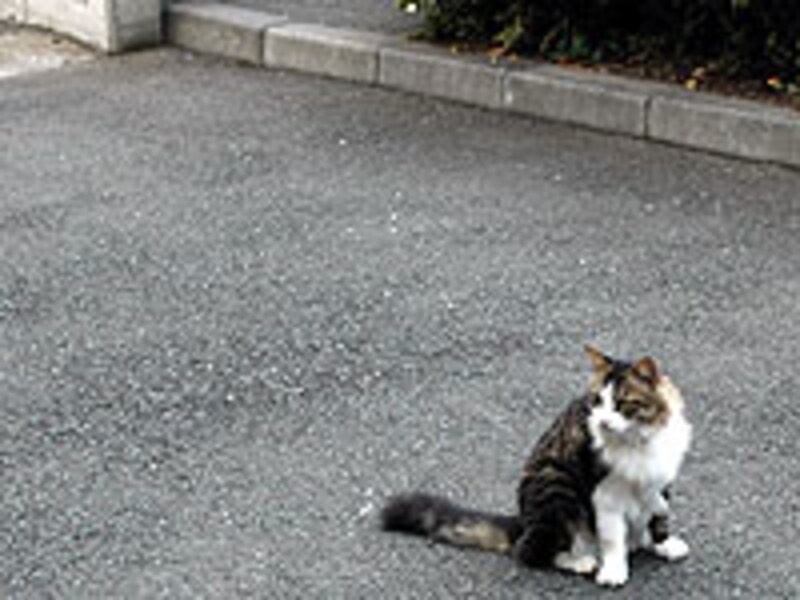 リョウ君は外出自由ネコですが、ほとんど寮の敷地から外には出ません。裏が山ですし、広大な敷地内の見回りだけで充分満足。