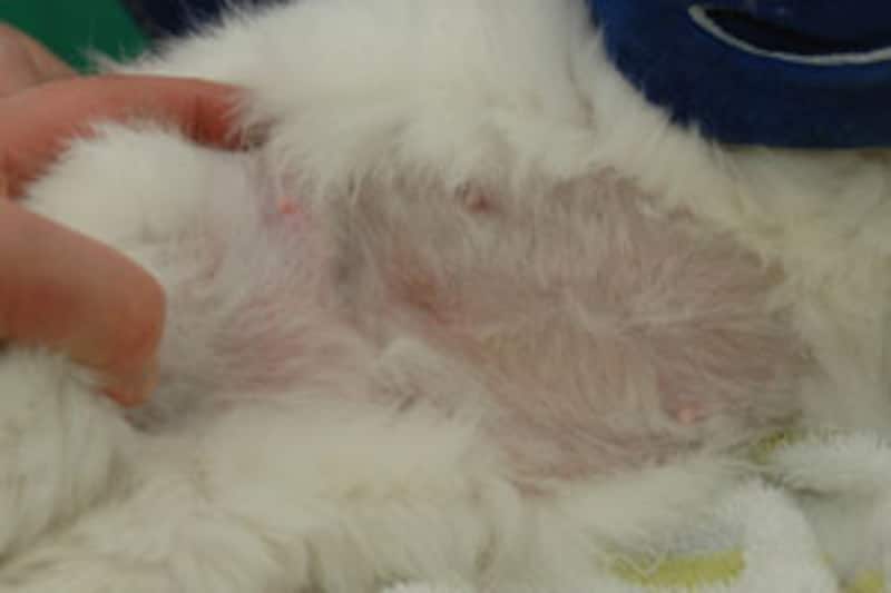 耳の後、お尻や陰部、お腹部分、特に背中から腰にかけて先っぽが硬いカサブタができて非常に痒がります。脱毛もみられます。
