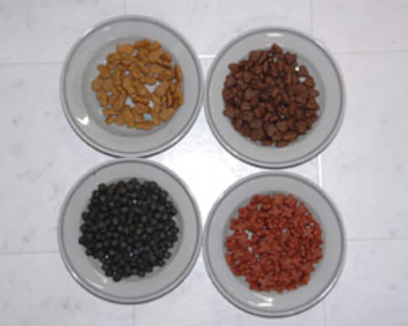 4枚のお皿に同種色/形のフードを入れて |