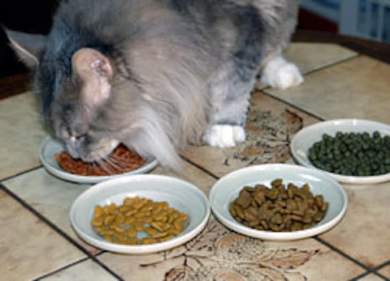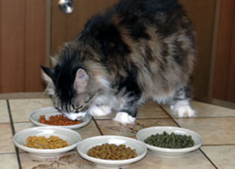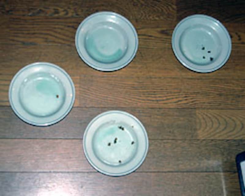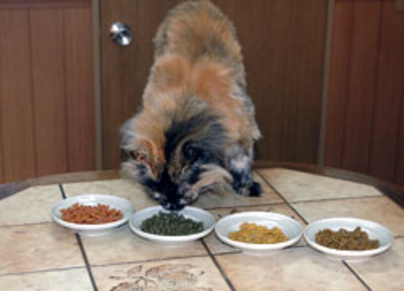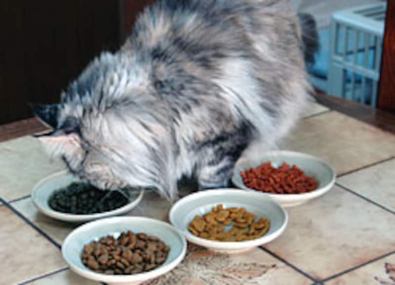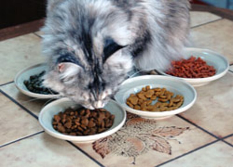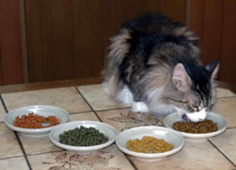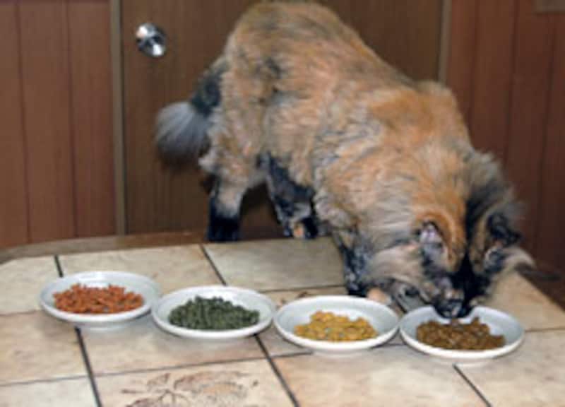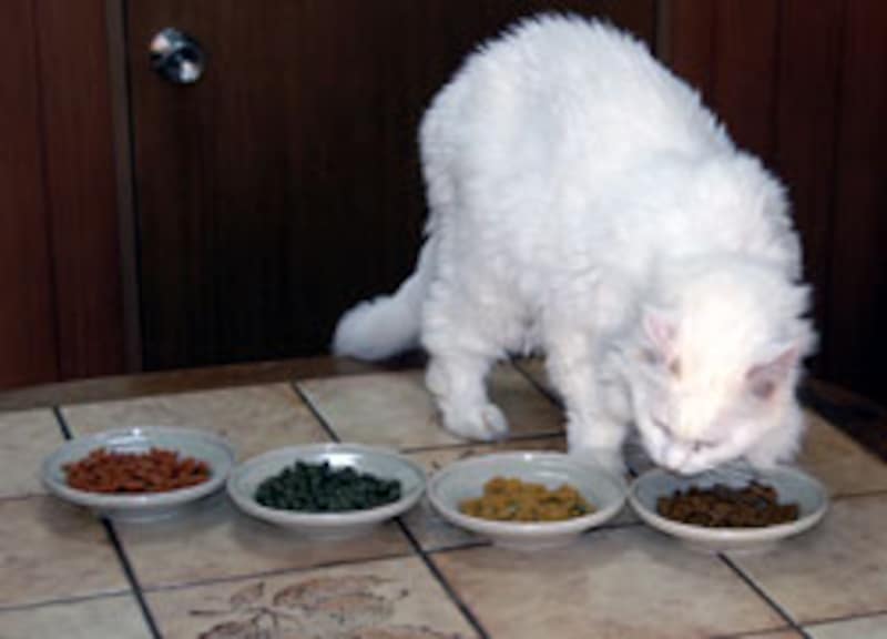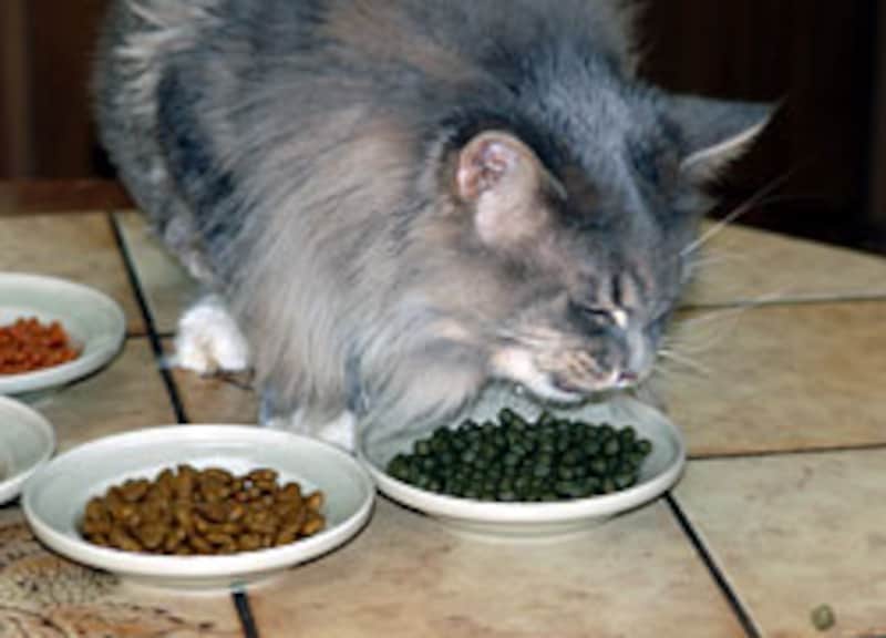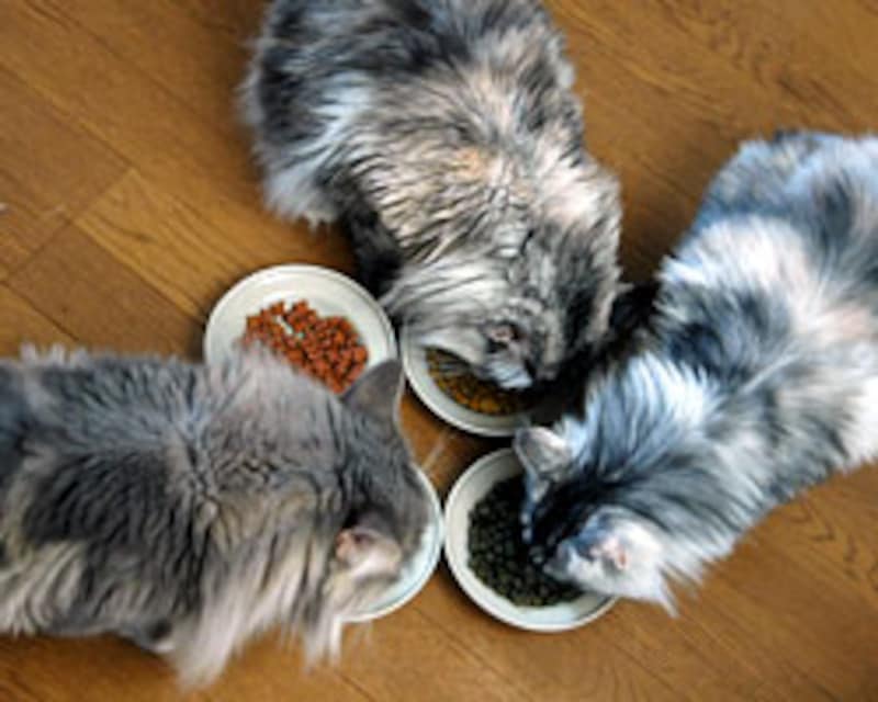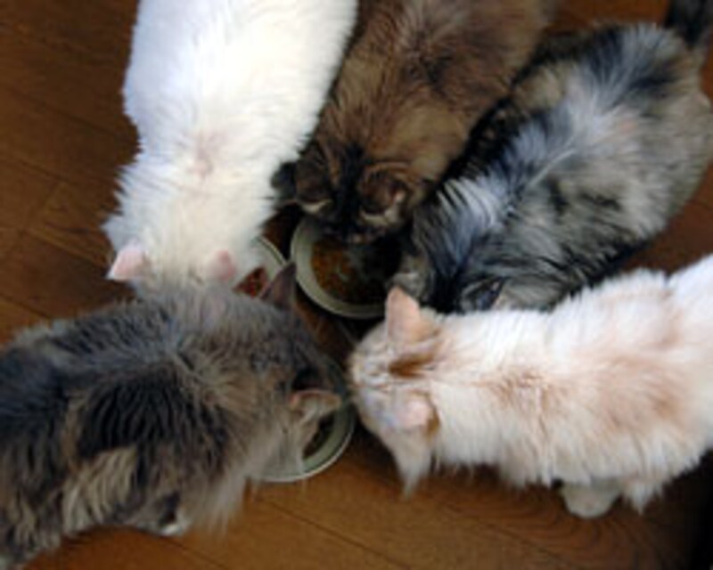 我先に、手前のお皿に顔を突っ込んで食べ始める。色/形には頓着がない様子。 |