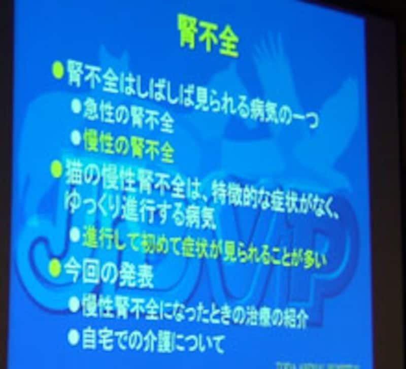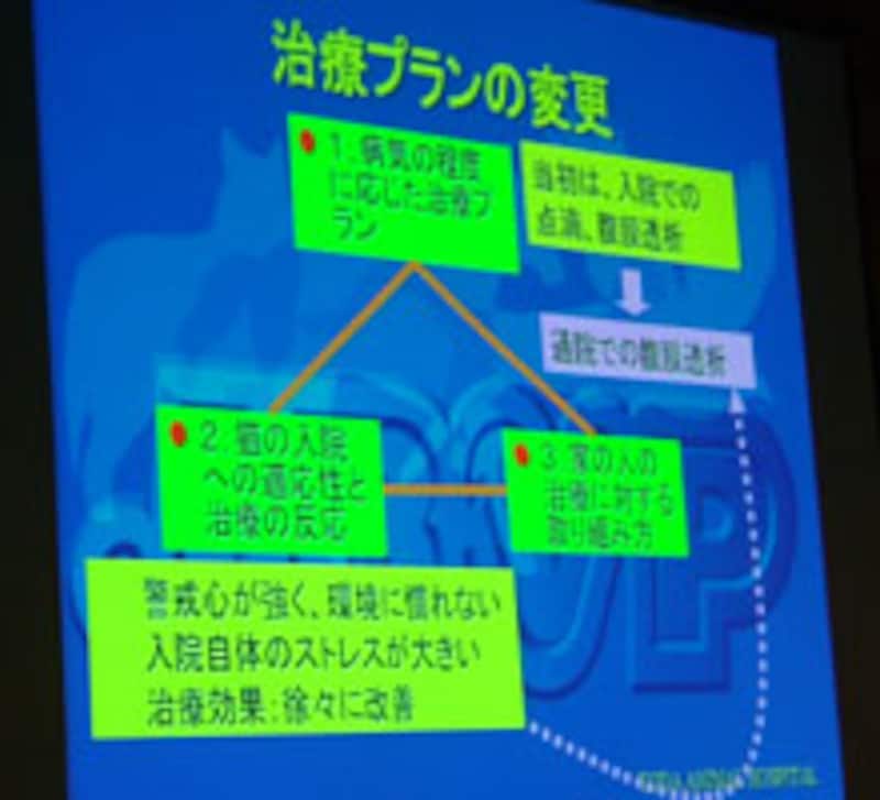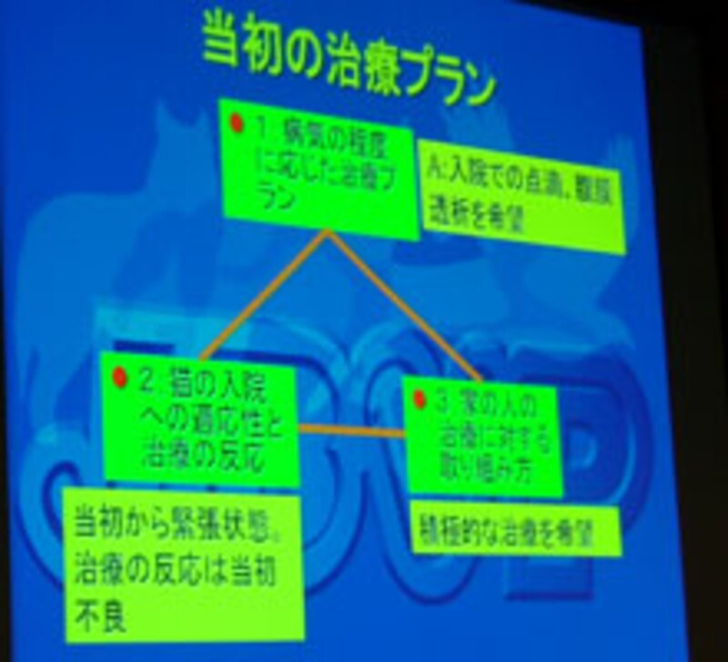 ここでは、入院して治療を優先させた症例、通院で治療を続けた症例、自宅介護で治療を行った症例、という3例の腎不全の猫の症例が発表されました。