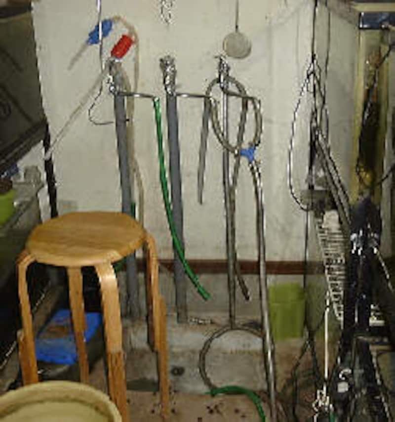 飼育部屋には必ず水道の蛇口と排水口、または流しが設置されています。もちろん、部屋の床は防水構造にしています。みなさんもありませんか?ケージを洗ったりするのに、人間が使う流しを使ったり、濡れた容器を移動しているときに部屋や廊下に水をこぼして奥様に怒られたりしたことが...そんな理由からも飼育している場所に水道があるのは便利です。