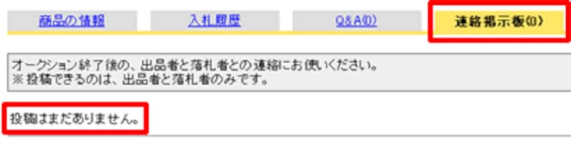 オークション終了まではなかった「連絡掲示板」タブが、オークション終了後、表示されるようになります。