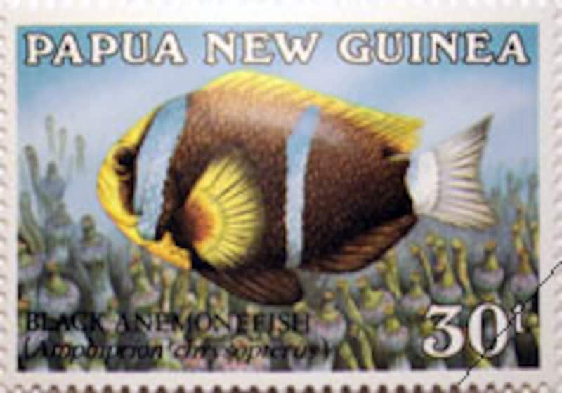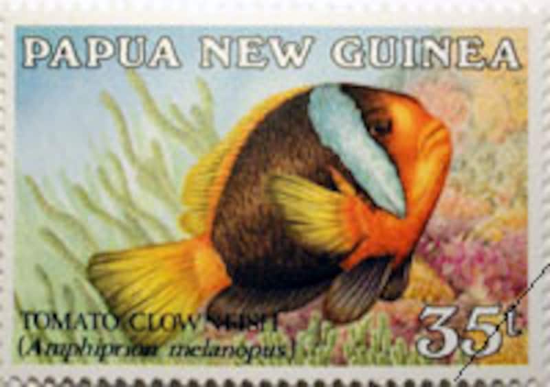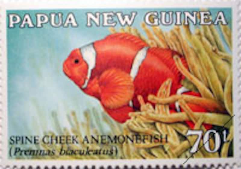 | 観賞魚としても人気の高い、クマノミの仲間には様々な地域固有種が存在します。 クマノミは、イソギンチャクとの共利共生(双方向に利益のある共存)が有名で、切手の中にもイソギンチャクが描かれている事が多いようです。また、クマノミは、生まれたときは全ての個体が雄で、やがて体の大きなものが雌へと性転換する特異な性質が知られています。この事を『雄性先熟』といいます。 |