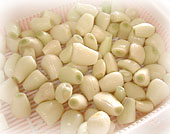 ざるに上げて、水けを切り、取りきれなかった薄皮を取り除きます。