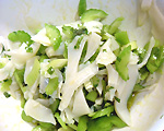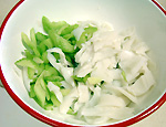 セロリは茎の部分をななめに切ります。厚さ1~2mmくらい、やや細めに。