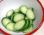 きゅうりのいぼを包丁で擦り取ります。またはピーラーで縞模様になるように皮を剥いてもOK。 そのあと、厚さ3mmくらいのスライス切りにします。 塩小さじ1をふり、まんべんなく手で揉み込み、3~5分おきます。 |