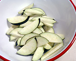 なすはへたを切り落とし、縦半分に切ります。 そのあと、厚さ3mmくらいの薄いスライス切りにします。 |