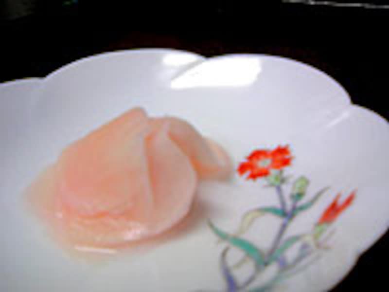(2)甘酢に漬ける。ちょっと置いて薄桃色に変われば、完成!