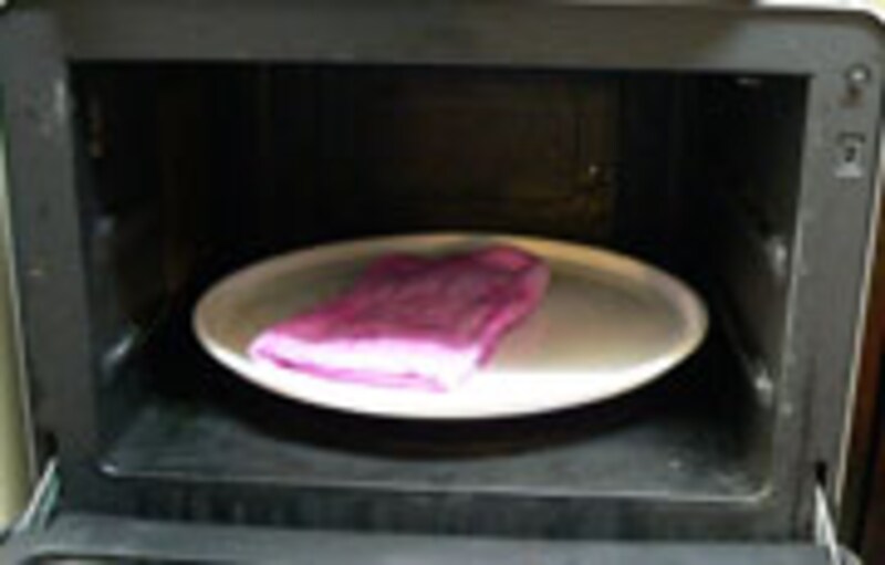 タオルをビチョビチョに塗らしてターンテーブルに置き、レンジ強で2~3分加熱(500Wで3分くらい)して、ゴム手袋をして濡れタオルをとりだします。タオルはすごく熱くなっていますので、やけどしないよう、よーく注意してくださいね。