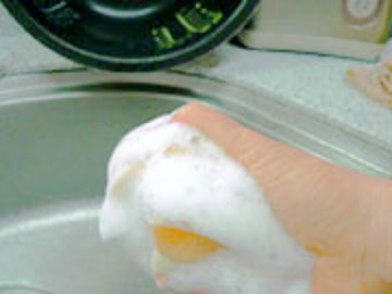 薄めた洗剤をスポンジであわ立てて汚れ面に塗り、その上からラップで覆って湿布をし(10分以上)、汚れをふやかしてからそのラップをスポンジ代わりに使って拭く。