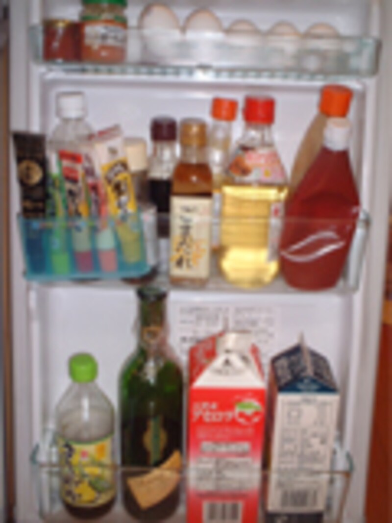 ― 冷蔵庫の大きさは? 140リットル。これだと入りきらないことも多いので、もう少し大きいものを購入してもよかったかもしれないです。 ― 冷蔵庫・冷凍庫の常備品を教えてください。 冷蔵庫には牛乳・アセロラジュースか100%ジュース・梅干。冷凍庫には市販の冷凍コーン・市販の冷凍グリーンピース・しょうが・にんにく・ねぎ・豆腐。 ねぎは刻んだものを、しょうがは丸のまま、刻んだもの、すったものを、にんにくは薄皮をむいたものを、それぞれ一回分ずつラップに包んで冷凍保存しています。そのときの手間はかかりますが、チューブのものを使うより美味しいですよ。 ― 保存しておくと便利なものは何ですか? ハンバーグと餃子を作ったときには、残った分を冷凍しています。ハンバーグは焼いたものと生のままのものを、餃子は生のままのものをそれぞれ冷凍しておくと、手早く一品仕上げることができます。 ― 調味料のストックを教えてください。 |