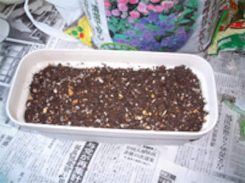 | ハーブ用の培養土を使い、種を蒔きます。雨や風などで流されないように、種の上に薄く土をかぶせます。 | |||