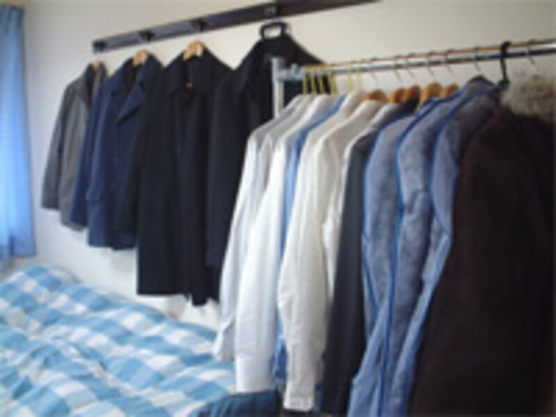 | ハンガーラックを使って、スーツ類がきちんと整理されて掛けられてはいますが…。 |