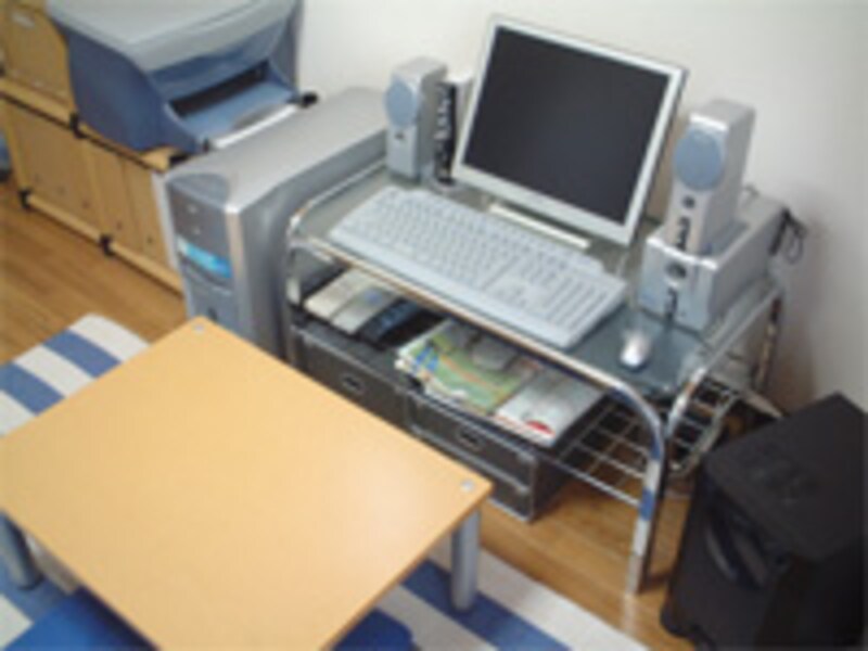 | ガラステーブルをセンターに、木のテーブルをパソコンデスクに使用するために購入しましたが、使い勝手が悪く、現在は逆に使っています。 |