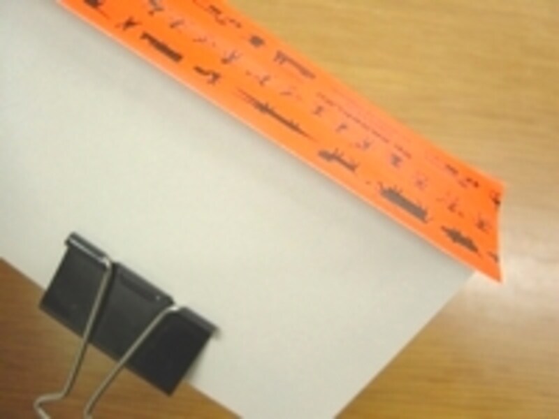 テープでとじる時にバラつかないよう、反対側をターンクリップで挟んでおきます。大きいクリップがない場合は、太い輪ゴムで縦にまとめておいてもよいでしょう。
