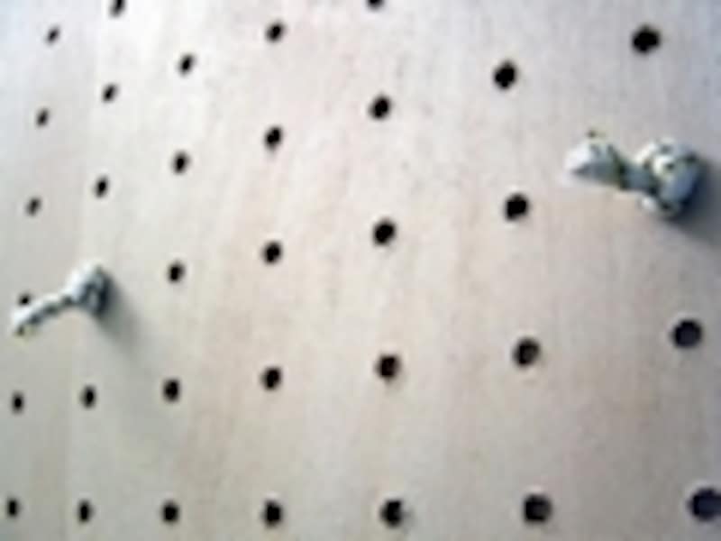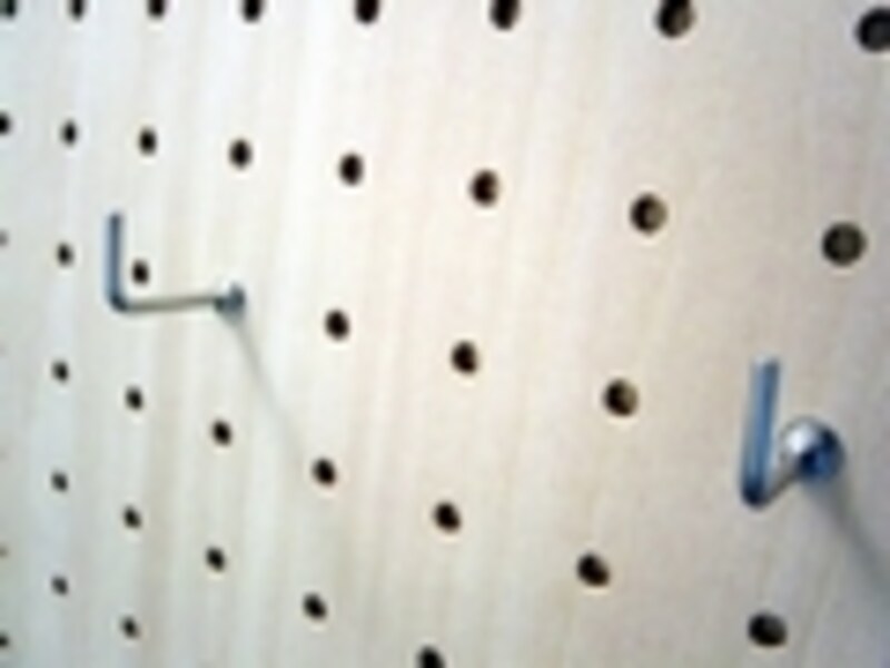 まず、正しい名称は有孔ボードです。タイトル用に当てはめた造語ですので誤解のないようにお願いします。さて、有孔ボードとは等間隔に穴のあいたベニヤ板のことです。ドリルやドライバーといった工具を持っていなくても、既に空いている穴を利用すれば、色々な小物が片付いてしまう「なんちゃって壁面収納」ができてしまいます。
