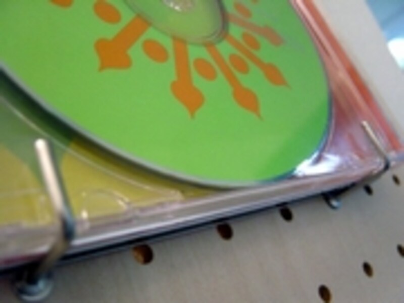 ナットつきヨーオレという金物だけを使ってCDをディスプレイします。このナットつきヨーーオレを買う際には、25ミリという長さのモノを探してください。3本入り百数十円程度でホームセンターにあります。25ミリというサイズのモノにするとCDが前後で2枚立てかけられます。