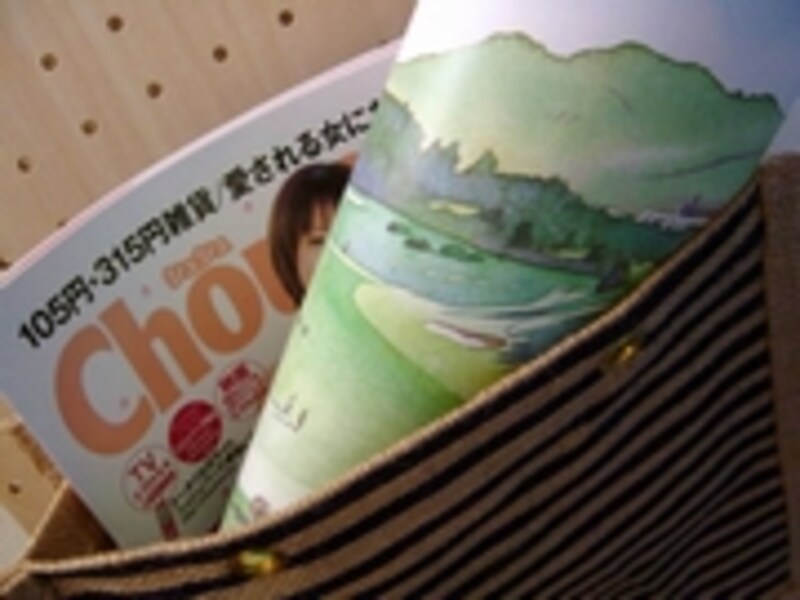 布製のトートバッグもしくは紙製の買い物袋の紐を取り外します。そして、紐を通してあった穴をヨーオレに引っ掛けるだけ。読みかけの雑誌、新聞のほか、DM、お知らせ、取扱説明書などをポンと差しておくことができます。