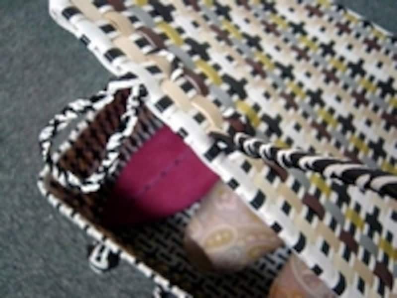 荷造りテープでできたバスケットは、PPバスケットとも呼ばれています。このバスケットの場合にはテープ色の組合せ次第で、2色使いのコンビ・バージョン、レインボーカラーのカラフル・バージョン、シック・バージョンも。