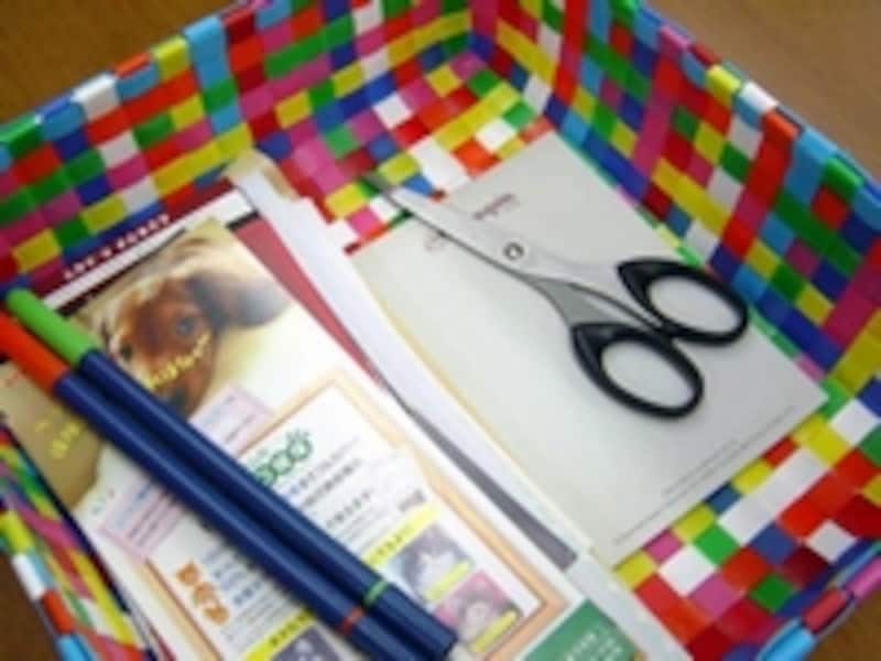 荷造りテープでできたバスケットは、PPバスケットとも呼ばれています。このバスケットの場合にはテープ色の組合せ次第で、2色使いのコンビ・バージョン、レインボーカラーのカラフル・バージョン、シック・バージョンも。