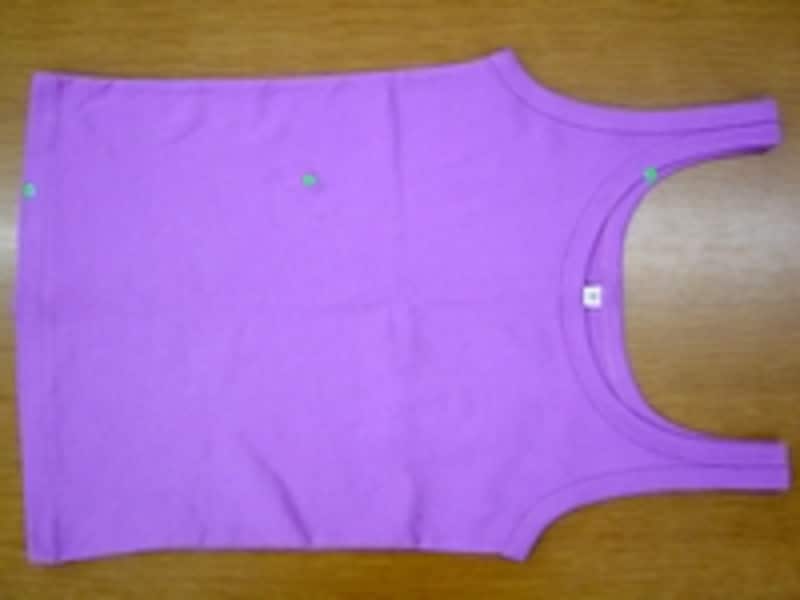 Tシャツの他には、ポロシャツ、ランニングシャツ、キャミソールも同じ方法でたたむことができます。その場合でも同じように、つまむ位置がポイントになります。右画像の緑の●印をつまんで、さばいて出来た形が左画像です。