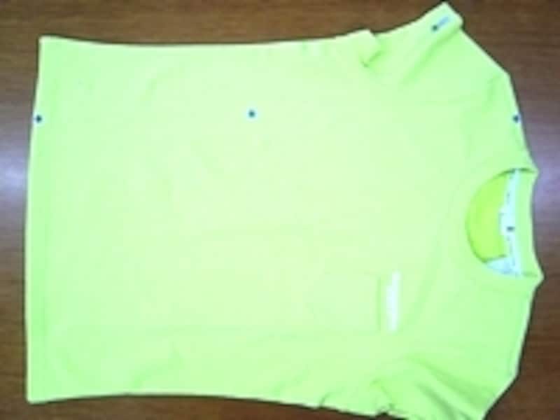 右下画像のTシャツに青い●シールを貼ってありますが、そのシールの位置が左画像のたたみ上がりの位置になります。