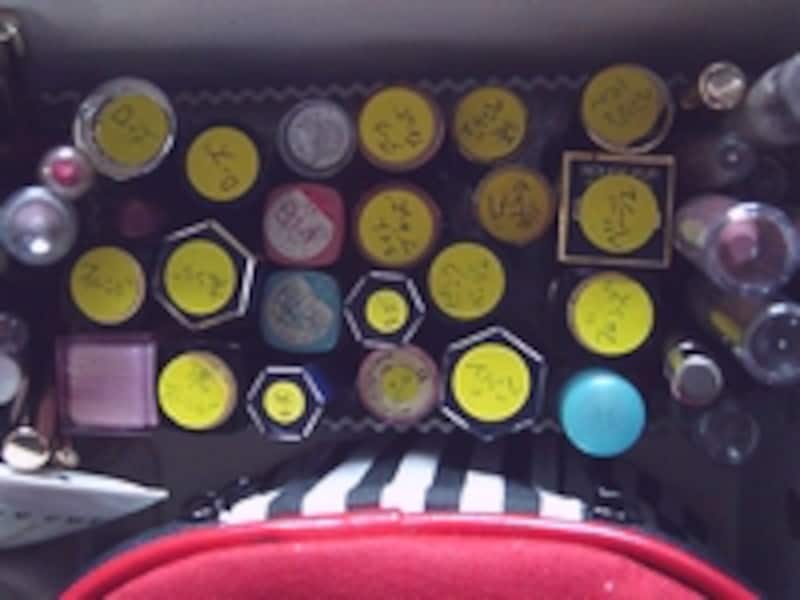 さらに、リップは上下を逆さまにして立たせること。 それは、リップのキャップを外す前に、中の色がわかるようにマーキングをするためです。たいがいのリップにはメーカーの色番号をプリントしたシールがついているのですが、それでは何色かわかりません。そこで、丸シールに色の名前を書いて底に貼っておくのです。