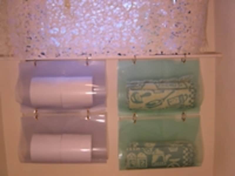 左半分にはトイレットペーパー、右半分にはタオルを収納。クリアホルダーの2辺がオープンになっているので、出し入れが簡単にできます。