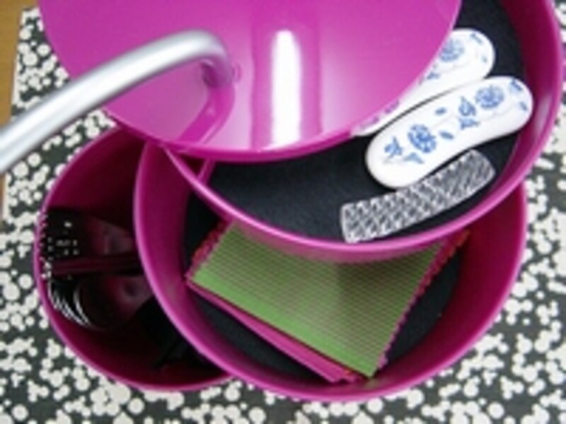 | 取っ手を中心に2段トレイが回転。一番下の段が深いので箸、スプーン、フォーク入れに。本来は化粧品を入れるケースですが……参考商品:コスメティックオーガナイザー |