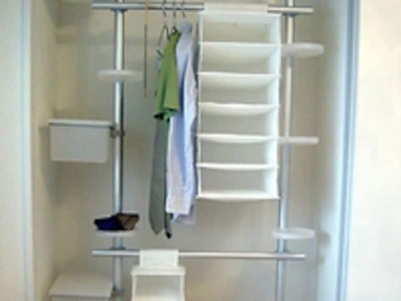 クローゼットの代わりになるような収納量が欲しい。部屋のくぼみを利用して其処を収納にしたい。そんな時にはもっと大掛かりな方法があります。見た目にはアルミカラーでスタイリッシュ。さらにパーツを組み合わせて、トレイなどのアクセサリーを付け加えると使い勝手の良い収納スペースの出来上がり。床から天井までたっぷりと使いながらもスマートな外観を保てるので、見せる収納としてこだわりを見せたい人には楽しいはず。
